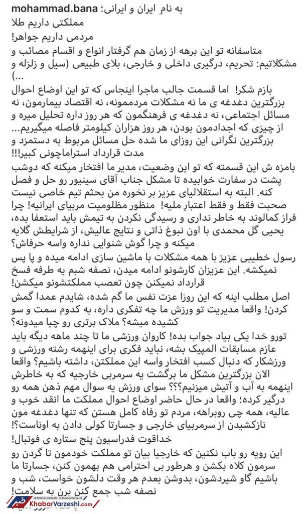 محمد بنا سرمربی سابق تیم ملی کشتی فرنگی کشورمان که یک هوادار افراطی پرسپولیس محسوب می شود، سالها پیش با حمله به رقم پرداختی به استراماچونی و خارجی های استقلال و سکوت در قبال ریخت و پاش تیم محبوبش در ازای جذب بازیکنان و مربیان، جنجال به پا کرد. او که پیشتر معتقد بود نتایج و قهرمانی های پرسپولیس واقعی هستند و در مستطیل سبز رقم خورده، این روزها با حال خراب تیم محبوبش به این نتیجه رسیده که نتایج فوتبال در خارج از مستطیل سبز رقم می خورد!